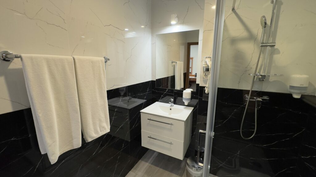 szafa, biurko, TV, łazienka z prysznicem, komplet kosmetyków, ręczniki